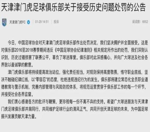 天津津门虎则表示“历史过错损害了联赛公平,俱乐部对此深感痛心”。